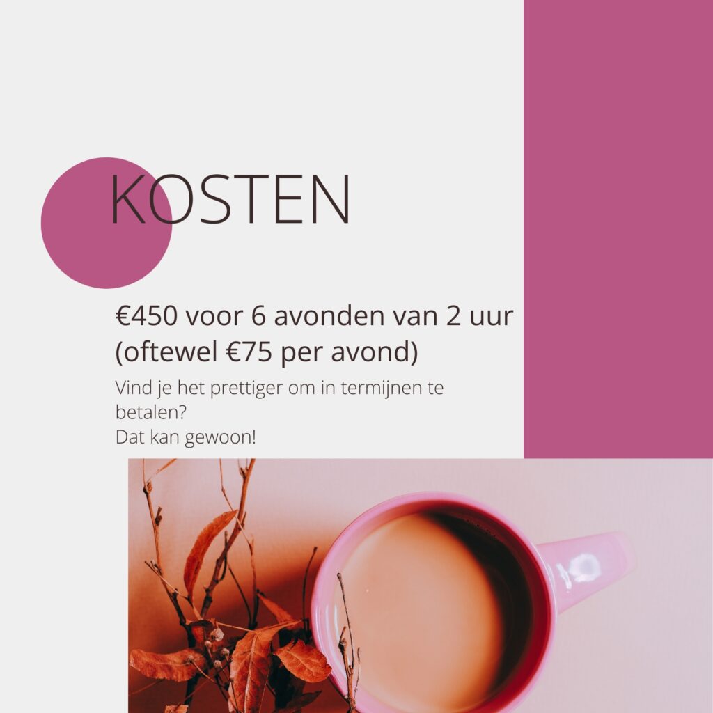 De kosten zijn €75 per avond. De avonden duren 2 uur en worden begeleid door 2 professionals.