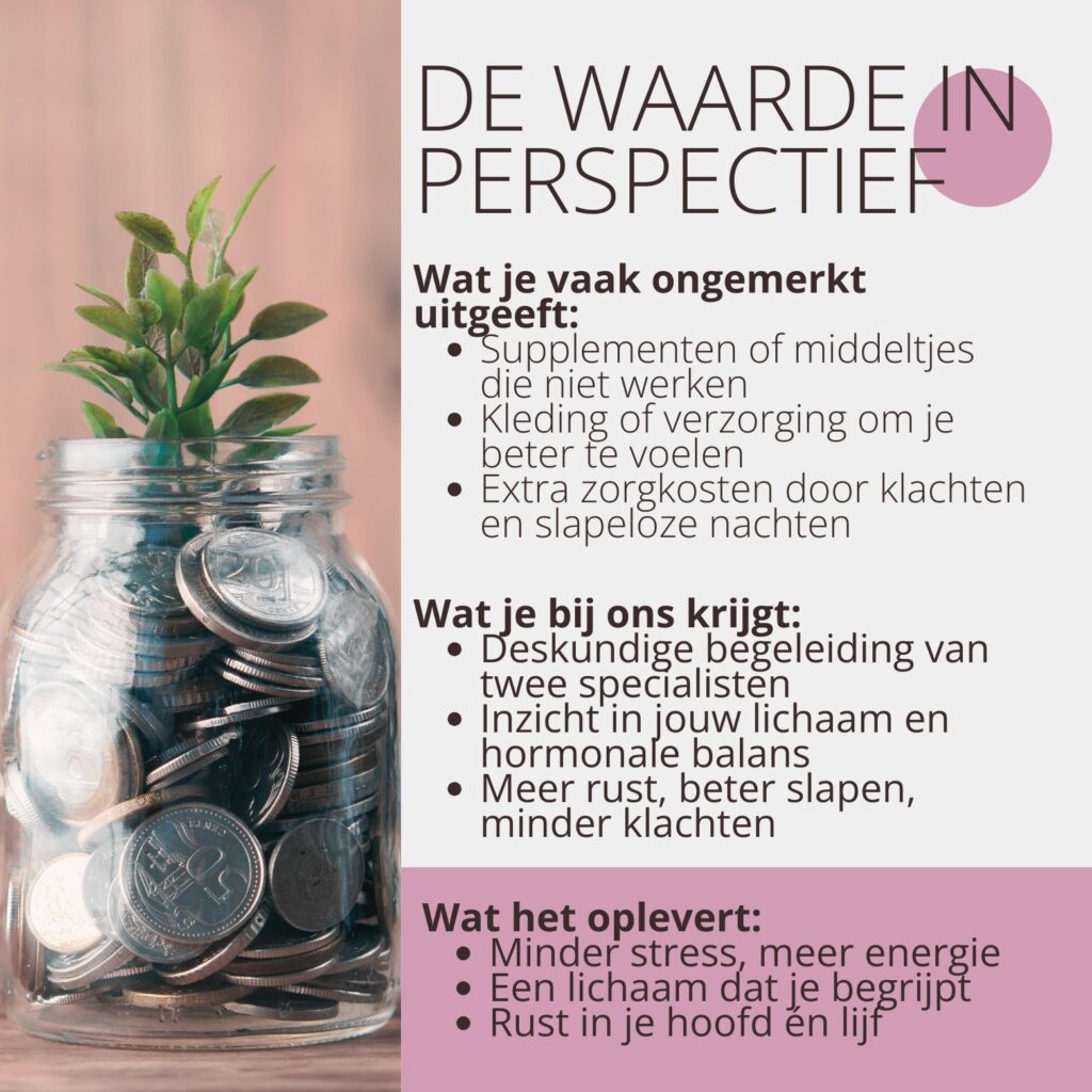 Met een huisarts gespecialiseerd in de gynaecologie en een ervaren leefstijlcoach aan je zijde krijg je nuchtere, wetenschappelijk onderbouwde uitleg en praktische handvatten die je direct kunt toepassen in je dagelijks leven.